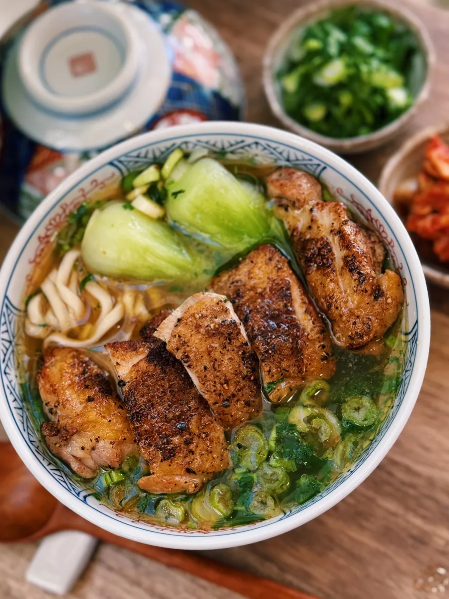 Soupe de Nouilles aux Oignons Verts avec Cuisses de Poulet Croquantes Cette Soupe de Nouilles aux Oignons Verts Facile avec Cuisses de Poulet Croquantes est un plat réconfortant taïwanais, plein de saveurs, parfait pour un …